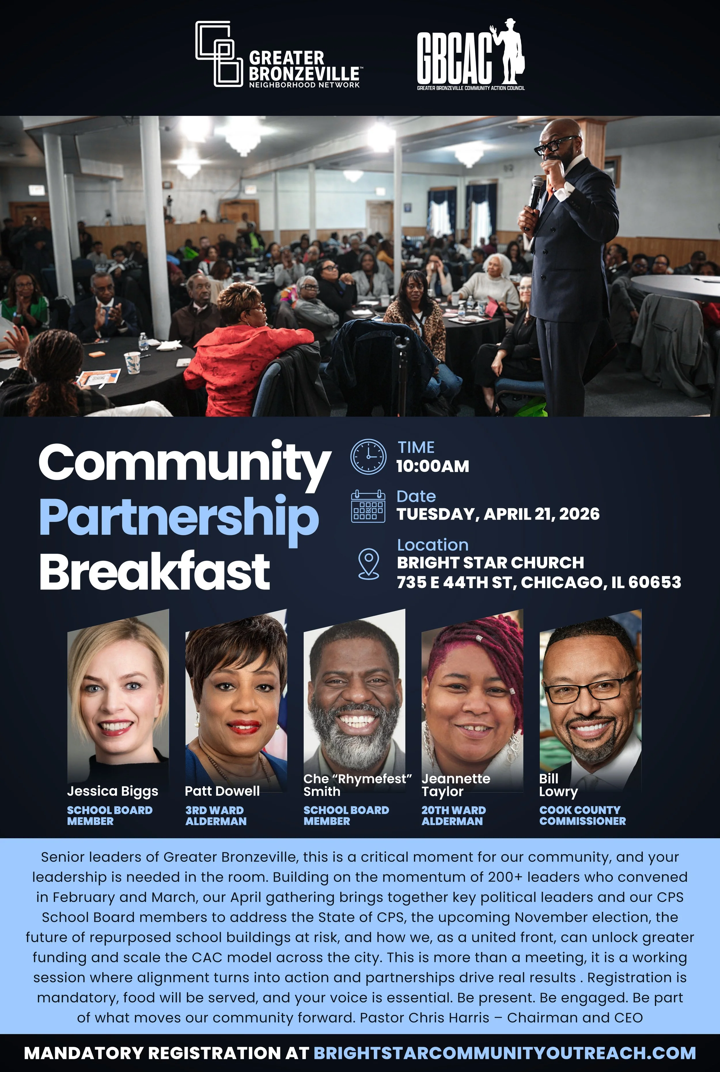Join us for the Community Partnership Breakfast, a critical convening of senior leaders across Greater Bronzeville focused on driving real solutions for our community. Building on the momentum of over 200 leaders who gathered in recent months, this working session will bring together key political leaders and CPS School Board members to address the State of CPS, the upcoming November election, the future of repurposed school buildings at risk, and how we can move as a united front to unlock greater funding and scale the CAC model across the city. This is more than a meeting, it is a space where alignment turns into action and partnerships drive results. The breakfast will take place on Tuesday, April 21, 2026 at 10:00 AM at Bright Star Church, 735 E 44th Street, Chicago, IL 60653. Registration is mandatory, food will be served, and your presence is essential. Be in the room. Be engaged. Be part of what moves our community forward.